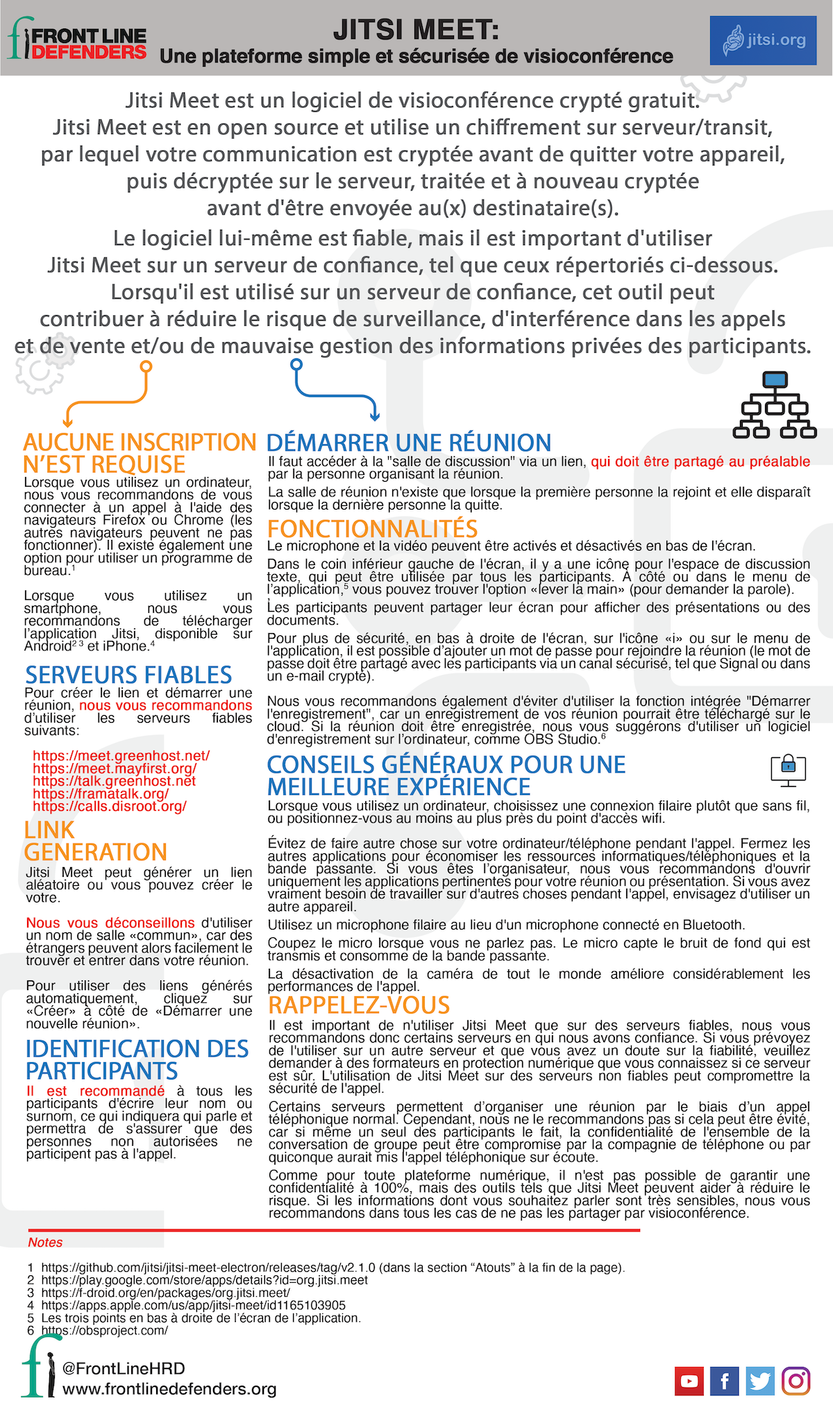 Jitsi Meet est un logiciel de visioconférence crypté gratuit. Jitsi Meet est en open source et utilise un chiffrement sur serveur/transit, par lequel votre communication est cryptée avant de quitter votre appareil, puis décryptée sur le serveur, traitée et à nouveau cryptée avant d'être envoyée au(x) destinataire(s). Le logiciel lui-même est fiable, mais il est important d'utiliser Jitsi Meet sur un serveur de confiance, tel que ceux répertoriés ci-dessous. Lorsqu'il est utilisé sur un serveur de confiance, cet outil peut contribuer à réduire le risque de surveillance, d'interférence dans les appels et de vente et/ou de mauvaise gestion des informations privées des participants.