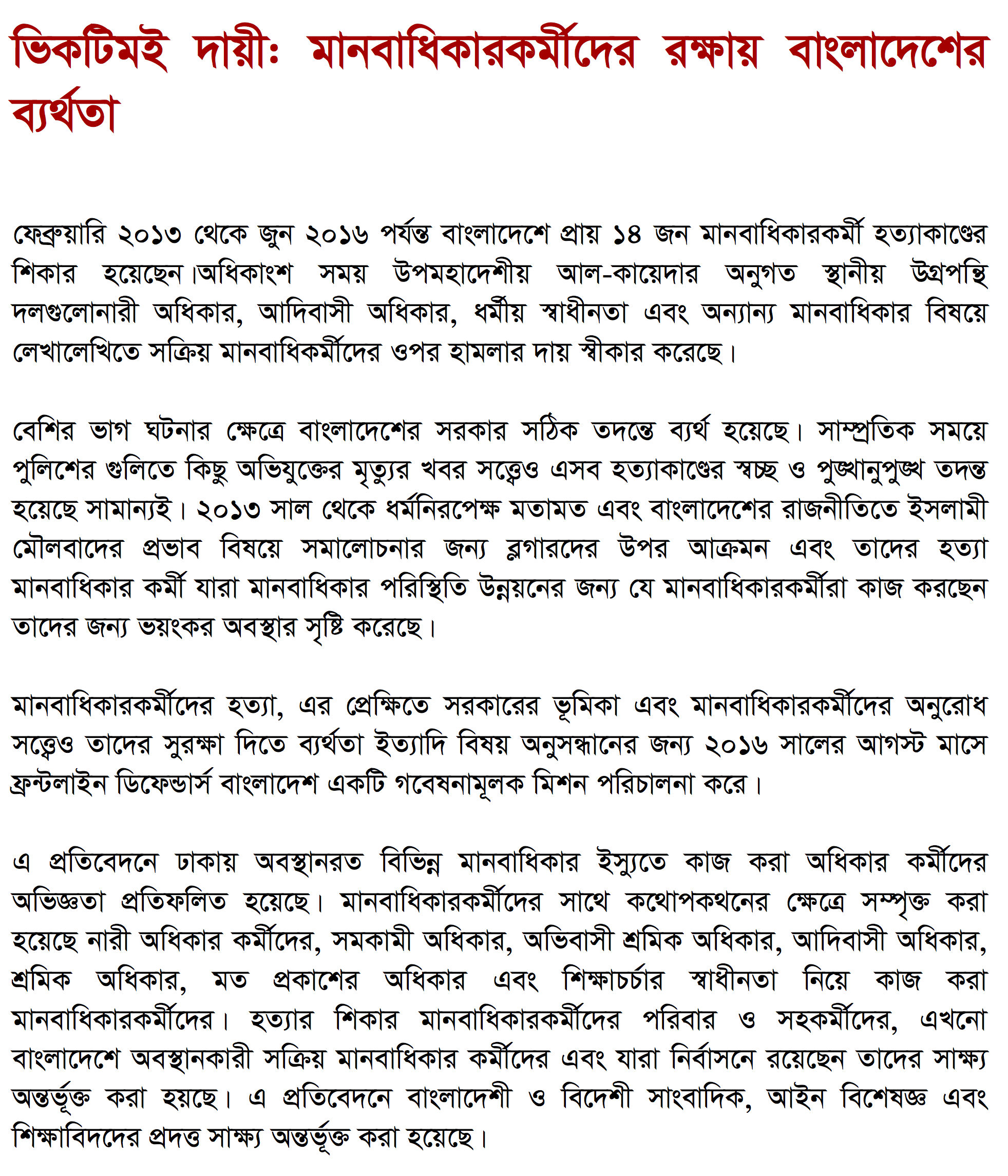 This report reflects the experiences of HRDs working on a variety of rights in Dhaka, though with national impact. HRDs interviewed include those working for the rights of women, LGBT groups, migrant workers, indigenous peoples, and labourers, as well as those fighting for freedom of expression and academic freedom. It includes testimonies from the families and colleagues of murdered HRDs, activists still working in Bangladesh, and HRDs forced into exile. It also draws on interviews with Bangladeshi and international journalists, legal experts, and academics.