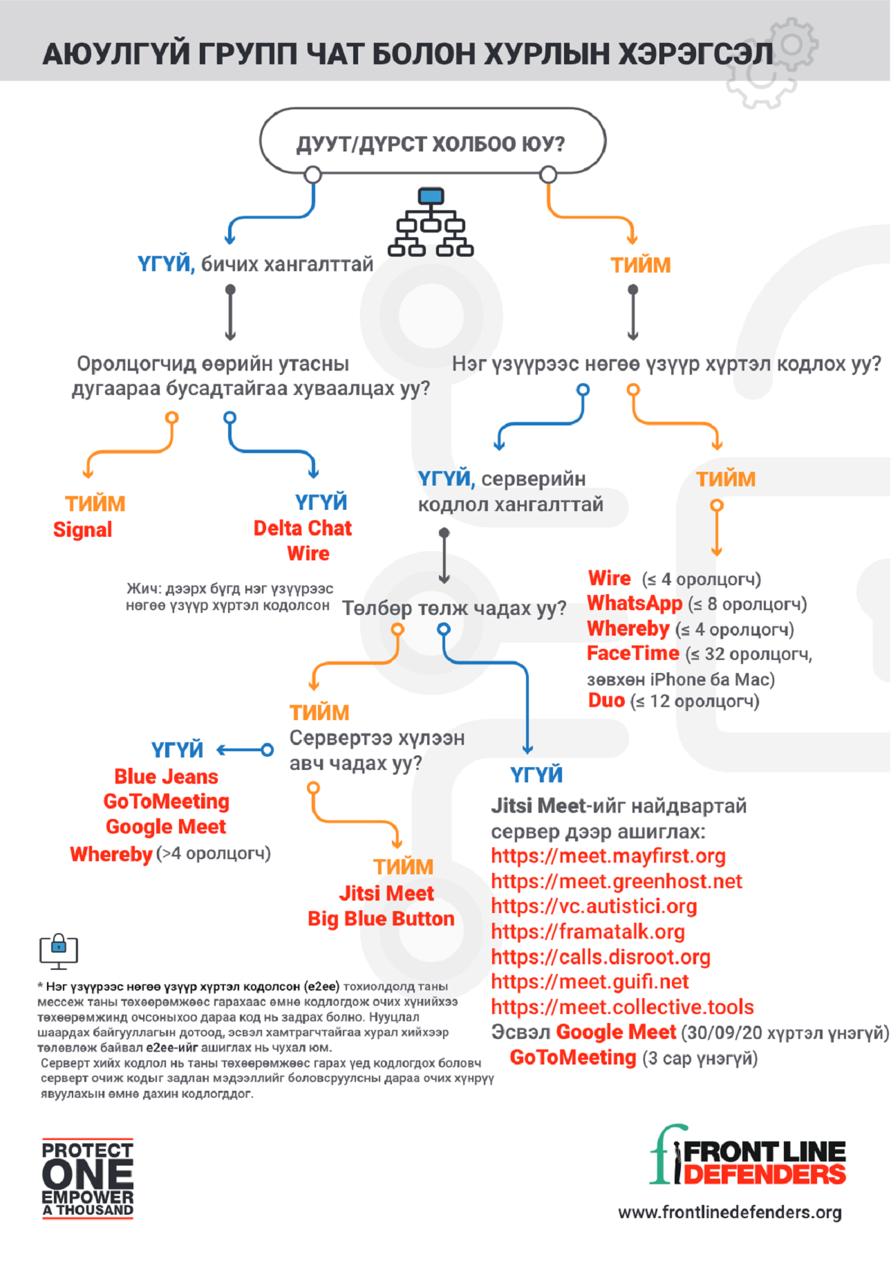 Zoom болон бусад хэрэгсэл/платформуудыг жагсаалтанд оруулаагүйн учир: Бүлгээрээ холбоо барьж болох маш олон платформ/хэрэгслүүд байдаг. Энэхүү зааварчилгаанд бид сайн үйлчилгээ хүргэлэг, нууцлал болон мэдээллийн аюулгүй байдлын хамгийн сайн үйлчилгээ үзүүлэх хэрэгслүүдийг сонгосон юм. Мэдээж эдгээр платформын аль нь ч 100% нууцлал, аюулгүй байдлыг хангаж чадахгүй, тодорхой хэмжээний эрсдэл байгаа. Zoom, Skype, Telegram, WhatsApp зэрэг хэрэгслүүдийг оруулаагүйн учир нь эрсдэл өндөртэй гэж үзэн Front Line Defenders бид санал болгохгүй байна.