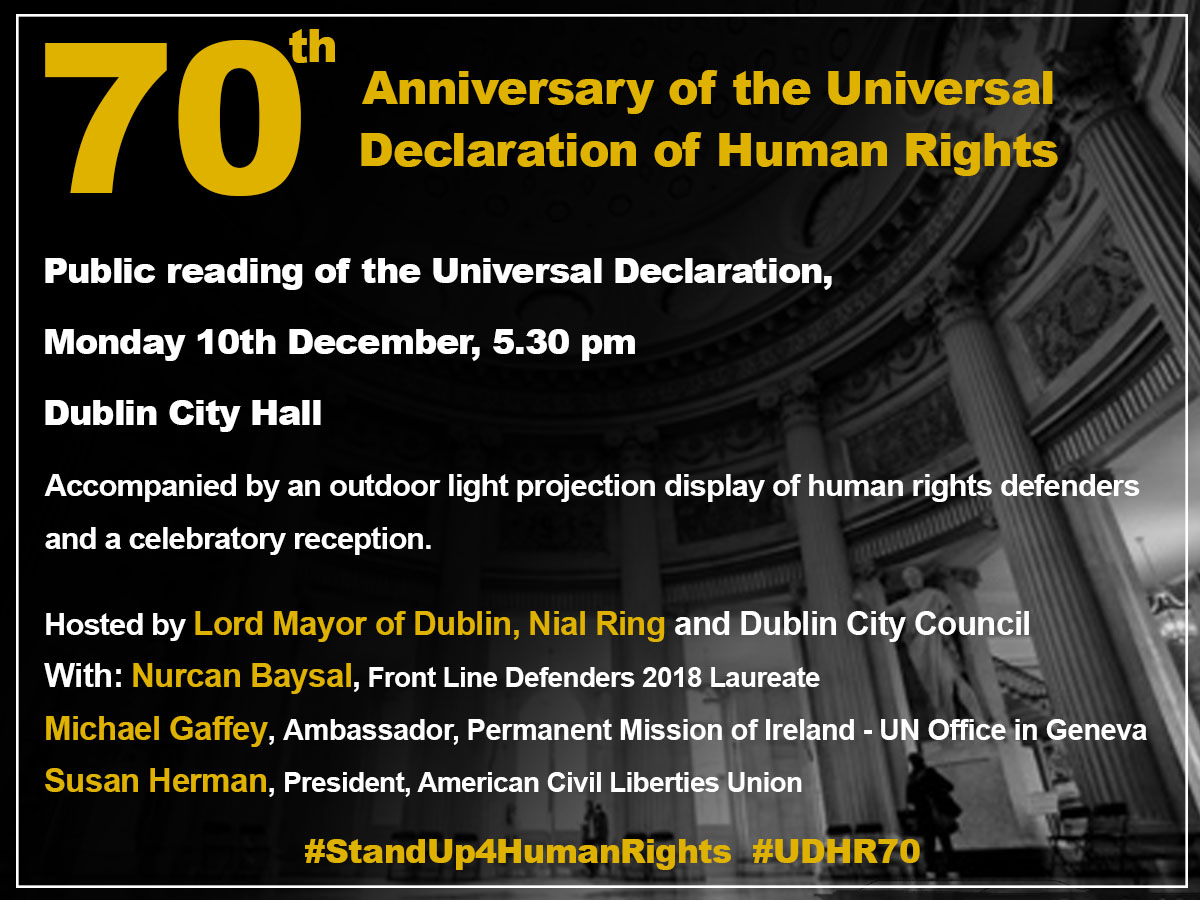 Lord Mayor of Dublin Nial Ring will read from the Universal Declaration of Human Right on the steps of City Hall at 6pm. Passages will also be read by: